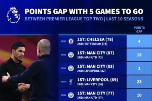 体育资讯4月23日讯 德国转会市场盘点了英超近10个赛季还剩最后5轮比赛时的前两名球队分差,本赛季0分最少。