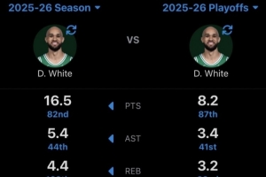 季后赛:场均8.2分3.4助攻3.2篮板,投篮命中率29.8%,三分命中率21.2%,罚球命中率85.7%。
