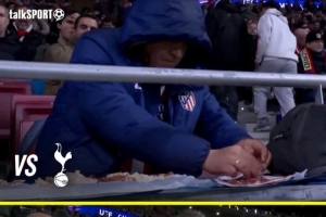 一位马竞球迷在前排桌位边看比赛边做美食,引发了媒体的关注,TalkSport社媒晒出照片,这位马竞球迷此前对阵热刺时也是在场边做美食。