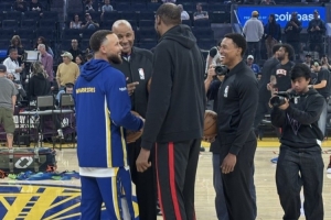 赛前,火箭球星杜兰特和勇士核心库里来到场地中央,进行一波交流。